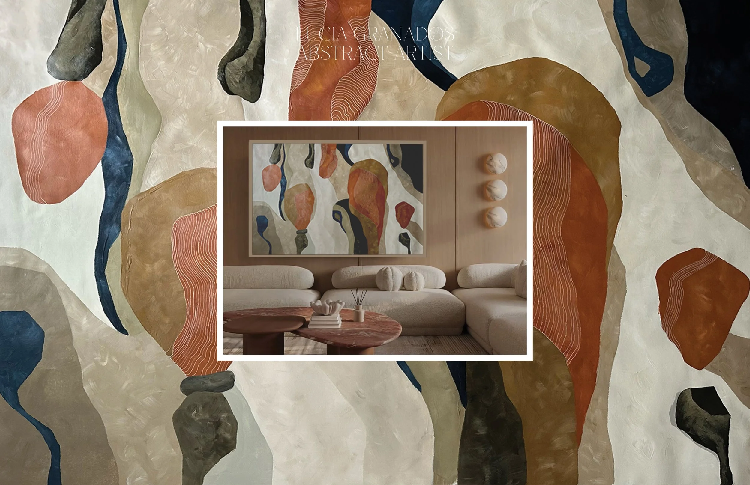 Lucia Granados is a Swedish/Colombian abstract artist based in Marbella. She is known for her large scale minimalistic paintings that convey a harmonious and balanced ambiance in any given space. By rejecting an objective truth and simply following the flow of current energies, Lucia creates a symphony of imperfect organic shapes which on an abstract level reflect daily life "movements", where everything we do are pieces of a puzzle which ultimately find their way together to compose a form of balance and calm.